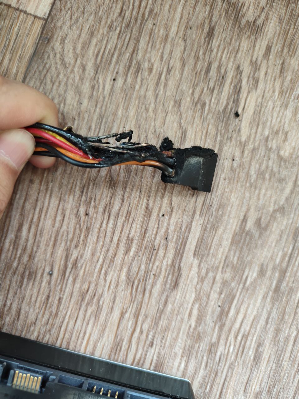 Опросил потерпевшего: услышал треск какой-то, не придал значения, думал дождь, потом дым повалил и он начал меня звать, параллельно по alt+f4 потушив игру и потом ПК. Он не завис, не залагал, просто выключил. Осмотр: обугленный HDD, явно горел дольше чем я бежал. сгоревший коннектор и провода питания HDD. Кстати, жесткий диск от прошлых хозяев остался и на нем была старая система с мусором (на всякий случай, вдруг им что-то понадобится), короче не использовался совсем. Почему я его вообще не отключил...