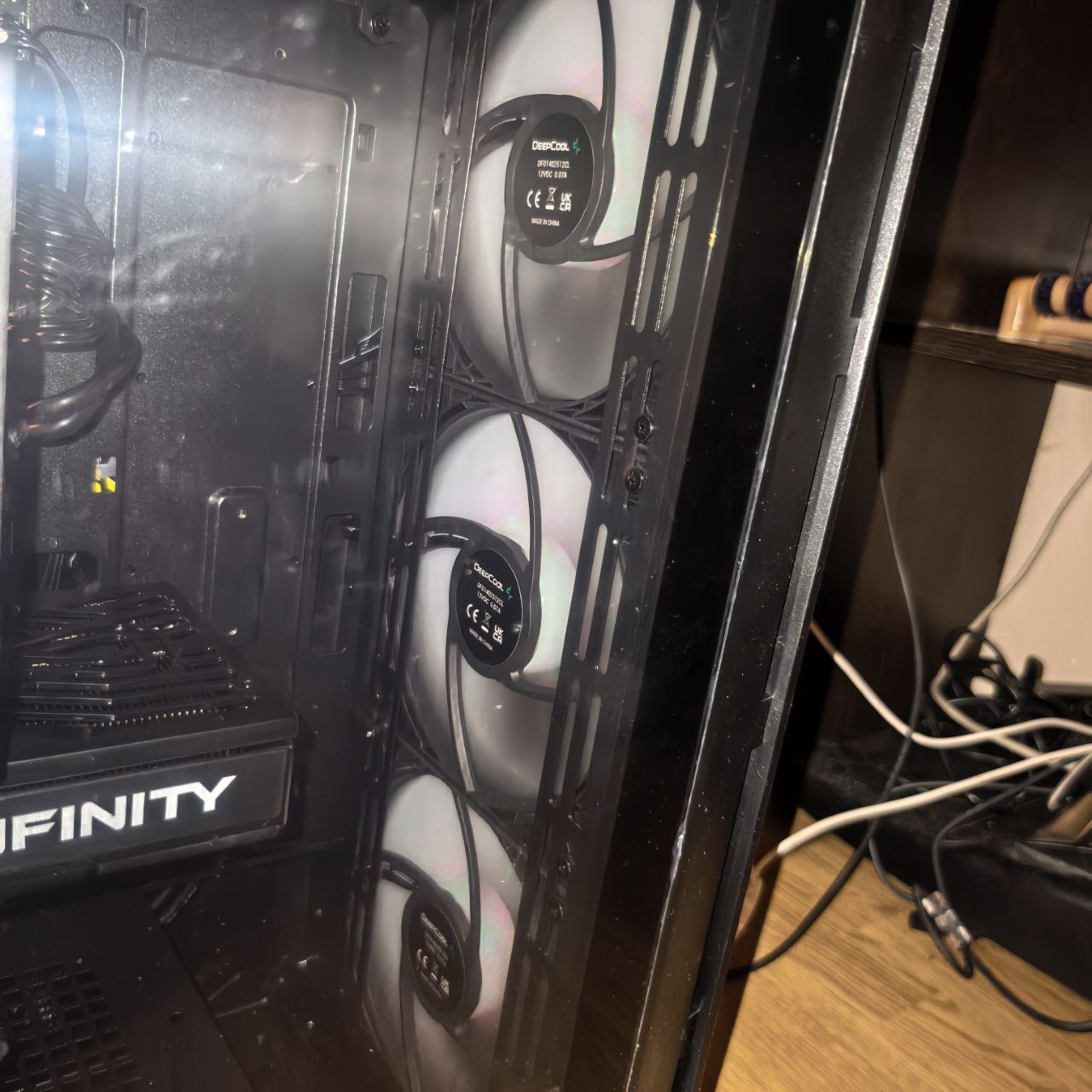 по фото системника - 3 вертушки на вдув стоят, одна на выдув? вертушки крутятся? наверху что за две наклейки - не закрыта ли вентиляция пленкой какой-либо?