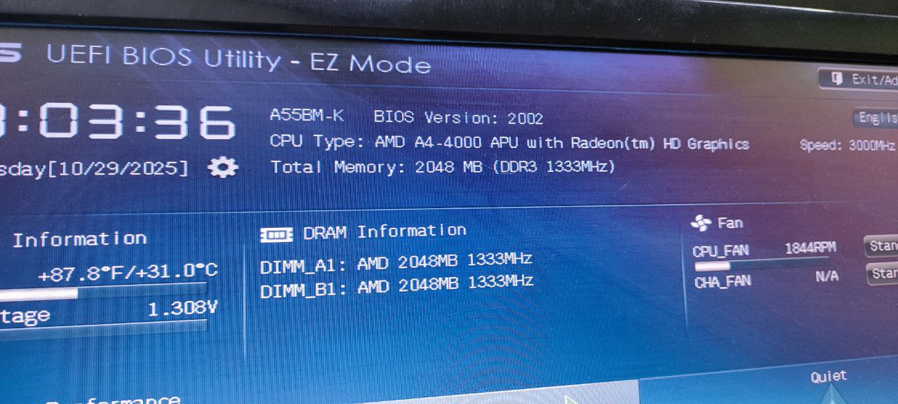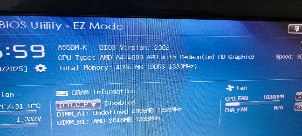 Помогите пожалуйста разобраться. Имеется старичек A55BM-K +AMD A4-400. Биос обновил до 2002 Установил две планки памяти AMD DDR3 2Gb Radeon 1333MHz (R332G1339U1S-UO), вроде как плата видит две планки по два но доступно к использованию только 2 гб