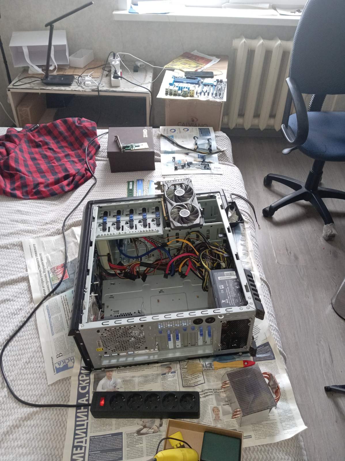 Вы имеете ввиду кабель питания 6pin? Там их три варианта у меня из БП..я уже все перепробовал,при том при открытом корпусе) Сейчас всё пересоберу с нуля ..мало ли