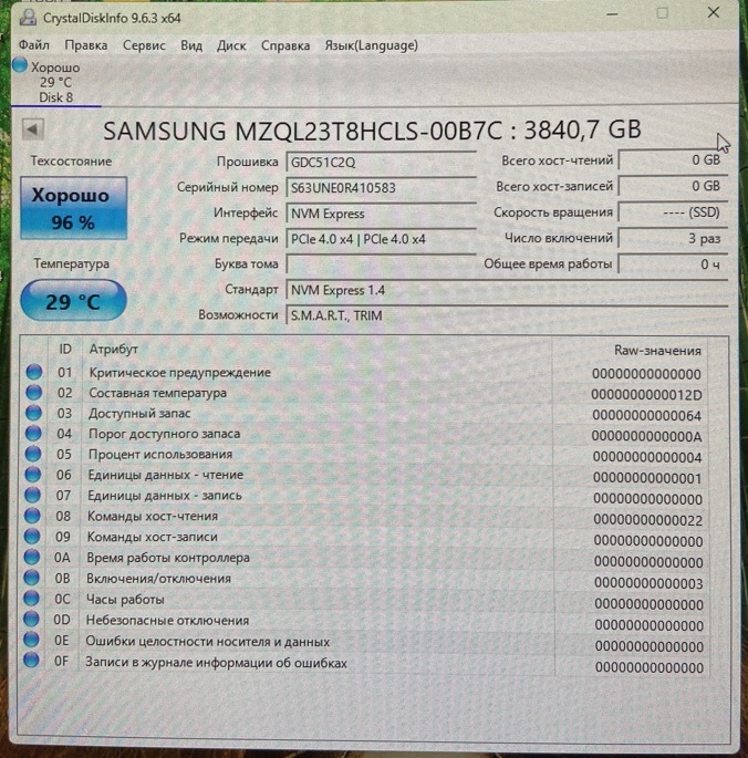 Диск странный, смарт явно сброшен, здоровье 96% а время наработки 0 ч Лучше проверить на другом компе.