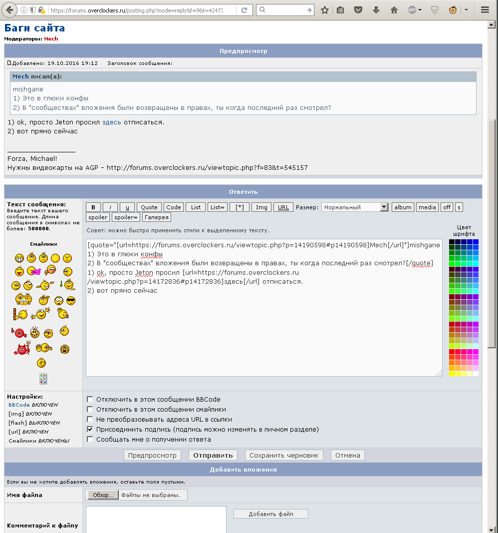 Mech В сообществах у обычных мемберов не работают вложения. В других подфорумах они работают. Эта проблема есть на чистом браузере, никакие адблоки с адгуардами в данном случае не влияют, они отключены (а даже если включить - в других разделах вложения все равно работают). Клуб ценителей ретро-железа - вот эта тема раньше была во флейме, вложения работали. Ее перенесли в сообщества, опция добавления вложений при ответе исчезла. Оверклокеры в World of Tanks 2016 - здесь сколько помню никогда не мог добавить вложения при ответе, еще задолго до того как началась борьба с рекламой. То есть проблема никак не связана с рекламой в принципе.