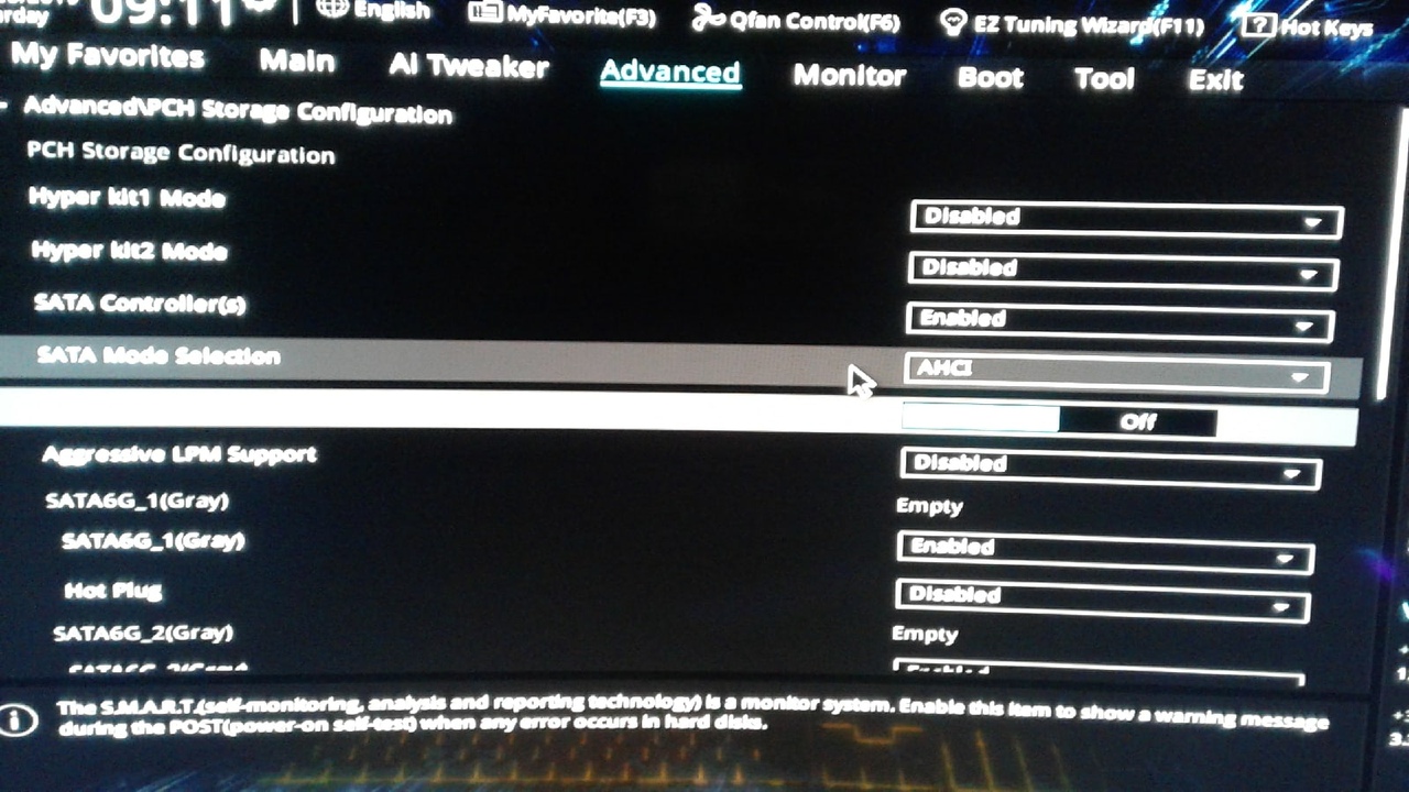 Здравствуйте. Я сейчас не могу проверить но если я не ошибаюсь у меня там всего 2 варианта sata mode, позже напишу какие.Я пробовал менять эти сата моды. И я забыл уточнить - эта ошибка выскакивает каждый раз при включении но если я нажимаю ф1 и захожу в бут меню дисков и просто нажимаю на свой ссд кингстон меня сразуже выкидывает без "сохранить и выйти" из биоса и начинает загружать винду , и работает всё корректно. Если ставлю спящий то нету ошибки. Только если нажимаю "завершить работу".