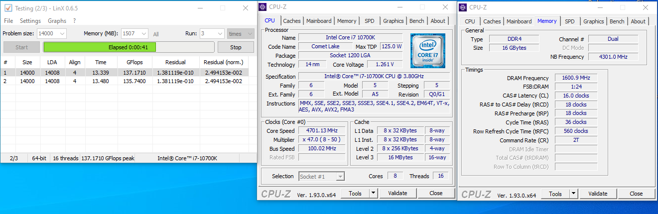 Вот результаты бенчмарка CpuZ - как я и говорил, проц находится в районе нормальных своих результатов, но в LinX почему-то такая фигня. Может и правда асус чего намудрили, фиг знает. В LinX 0.6.5 вообще ещё в 2 раза меньше результаты... в целом то мне пофиг на этот LinX, главное чтобы в играх и в рендере он работал как остальные 10700k, но внутренний перфекционист не может спать спокойно.