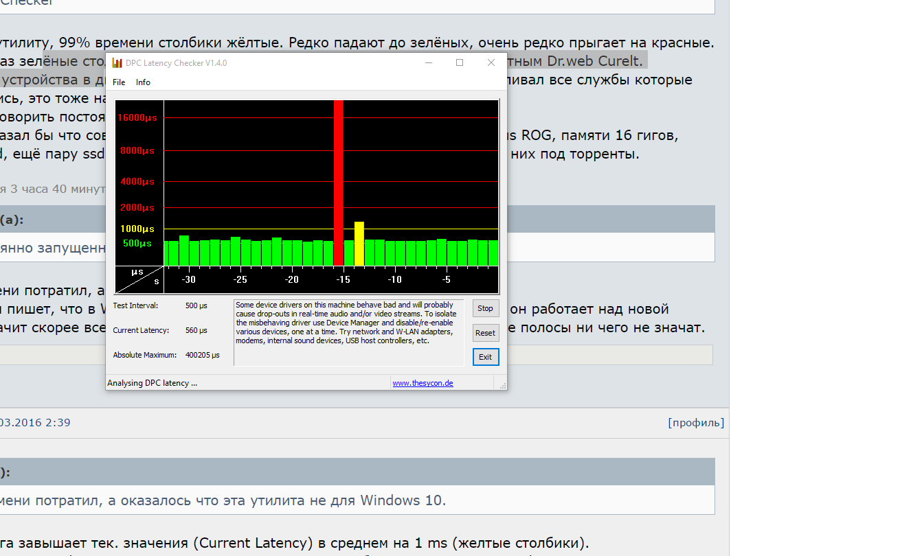 Как эта прога может помочь найти причину? ну покажет она что задержка в какой то момент возникает запредельная, но она не укажет что конкретно вызвало её. Я уже эксперемиентировал с ней, отключал все службы, все устройства какие смог отключить, на поведение DPC Latency Checker это ни как не повлияло, всё равно возникают красные пики. Прога LatencyMon хоть показывает задержку на конкретных драйверах устройств, однако это тоже не помогает решить проблему. НУ обновил я драйвера на чистую, толку то всё равно ноль, что то вызывает задержку на этих драйверах. а что не понятно. Самое интересное даже на запредельных показаниях задержки бззз возникает далеко не всегда.
