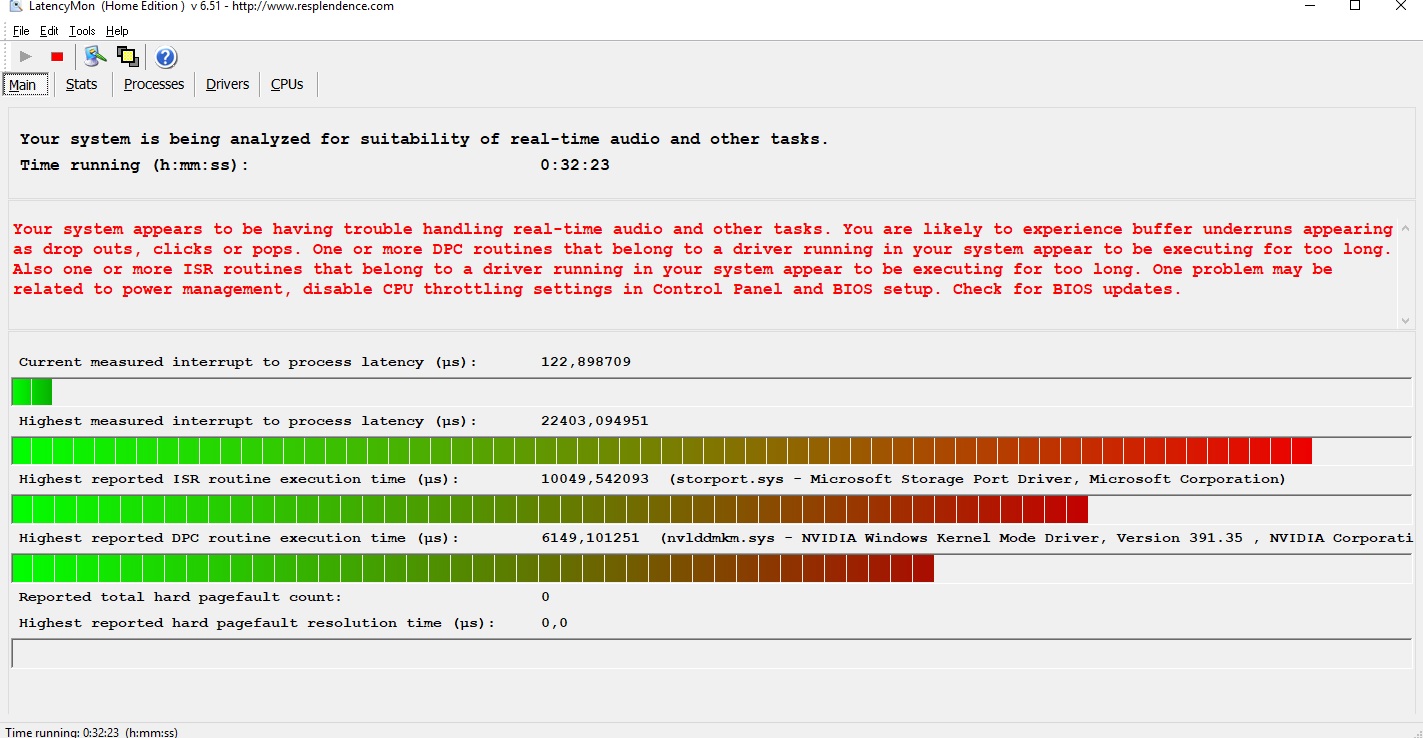 А я столько лет сидел на 7ке и всё было отлично, но на днях с покупкой ssd решил уже перейти на 10-ку и такая же проблема как у вас: играет музыка в вк и периодически раз в пол часа подвисания на пол секунды сопровождающиеся дребезжанием звука ну и подвисанием в игре. Как лечить ? Windows 10 pro 1709 со всеми обновами. Думал, что это из-за отключение питания 2ого hdd при его не активности, но нет. Вот что пишет LAtencyMon после ~30 мин и 2 подвисаний: