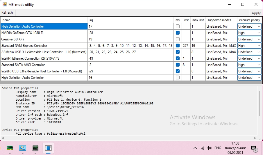 выбрать нельзя, ты можешь что-то(из делящего одно прерывание) перевести в мси режим, как это сделано у тебя для видюхи(как вариант, это и убрало заикания, нвидиа дрова не ставят вроде Мси режим, если не ставить их посредством NVCleanstall и там выбрать эту опцию). Но не всё может в него переходить(например твой IO -06E9 может не среагировать на перевод его в режим мси=минуса не появится перед числом), + некоторые звуковухи могут начать молчать(например если PCI X-fi подключённый через переходник перевести в мси режим). Ну и помним, что все изменения глядеть, после - Apply+перезагрузка.