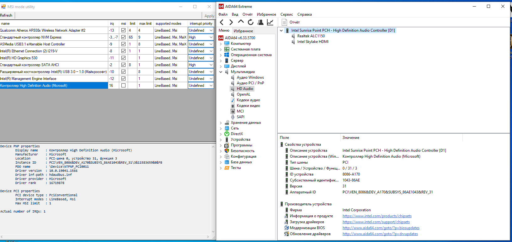 Странно, что МСИ утиль не видит других аудио. МС режим пробовал включил, присваивает прерывание -12 и 0 реакции. Все так же.