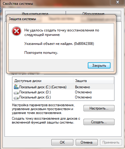 Не создает точки автоматически и вручную создать нельзя. Пробовал отключать и включать, включать на других дисках , задавал 10 гигов под это. Месяц назад вроде еще создавало точки автоматически, когда точно началось не знаю. Словил неделю назад один current pending sector на харде от выключения эл-ва, просканил стандартным средством винды(исправлять сис. ошибки + восстанавливать сектора) нашел и исправил 1 файл hiberfil.sys. Не знаю виноват ли хард в восстановлении системы, но указал на всякий. Кто что знает подскажите. Винда лицензия 7 64бит со всеми обновлениями.