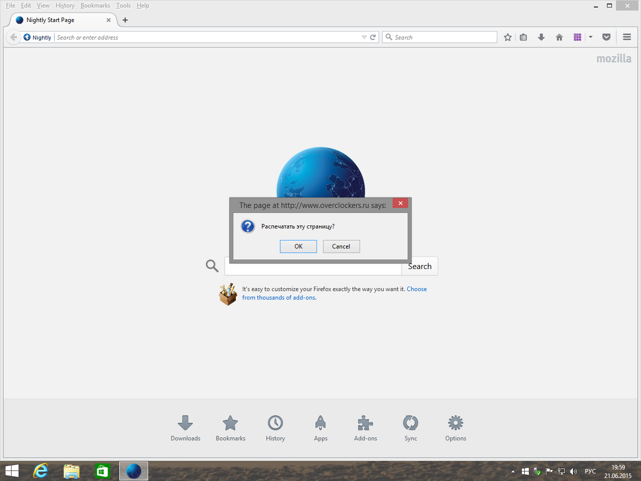 При работе с браузерами периодически может возникать окно с предложением распечатать страницу : The page at http://overclockers.ru says: Распечатать эту страницу? OK Cancel На компьютере установлен Касперский интернет секьюрити, ничего не находит. АVZ тоже пусто. Переустановка Nightly ничего не дала. В профиле Оперы, нашлась ссылка удалил. Обращаюсь на за помощью здесь, так как ссылка на Ваш адрес. С уважением alchimik. P.S. вкладываю файл с изображением страницы с сообщением.