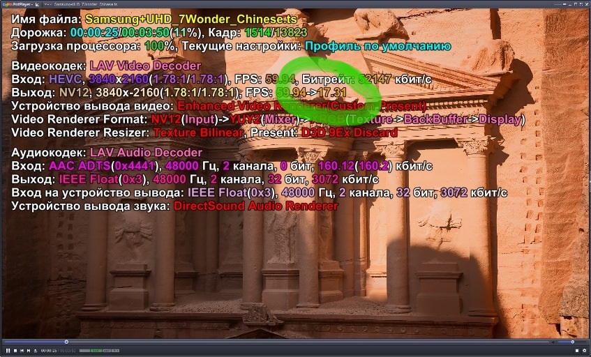 PancheZ Скачал Ваш файл, быстренько настроил Portable PotPlayer c LAVFilters. На моём конфиге, естественно, не пошёл нормально(так как нету аппаратного декодера HEVC). В отличии от Вашей 9-серии Nvidia. На Вашем же конфиге, должно быть намного лучше всё, даже софтварно процессором. Т.к. у меня было 14 FPS(пропуск кадров, естественно):