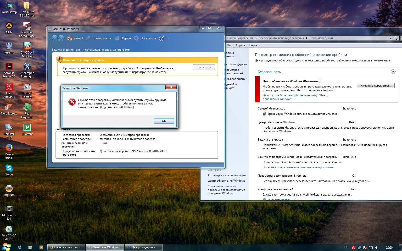 у меня антивирусник avira free провел сканирование нашел какой то вирус под именем "heur/modified.systemfile" вот ну и начал их короч эти файлы 31 штуки выдавать. повторно раза 2-3 сканировал всё тож самое. ладно скачал утилиту доктор веб курейт и зашел в безопасный режим, запустил эту утилиту про-сканировал от корки до корки, угроз не найдено (0). 0о в шоке, авирой просканировал, нашел. что это как бороться? у меня ещё защита в реальном времени выкл, не знаю как активировать код ошибки 0x800106ba пишет. (( и у меня не работает защита в реальном времени он (выкл) в защитнике виндовс 7 пытался включить но он выбивает ошибку (0x800106ba) а в центре поддержки и безопастность говорит то что он включённый помогите пожалуйста как устранить две проблемы?