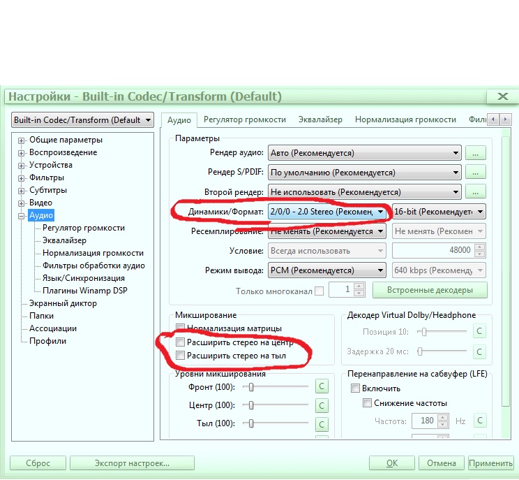 Есть з\к Asus Xonar D1, акустика 5.1. При воспроизведении в Pot Player видео со звуковой дорожкой 5.1 саб работает, но если включить музыку, либо видео со стерео дорожкой, все колонки играют, а саб нет. В MPHC аналогичная проблема решилась установкой ac3filter и указанием в нем 5.1 канального звука. Т.е MPHC весь звук воспроизводится адекватно, а в Pot Player - только многоканальный. Подскажите, какие настройки покрутить или м.б. ему можно скормить тот же ac3filter?