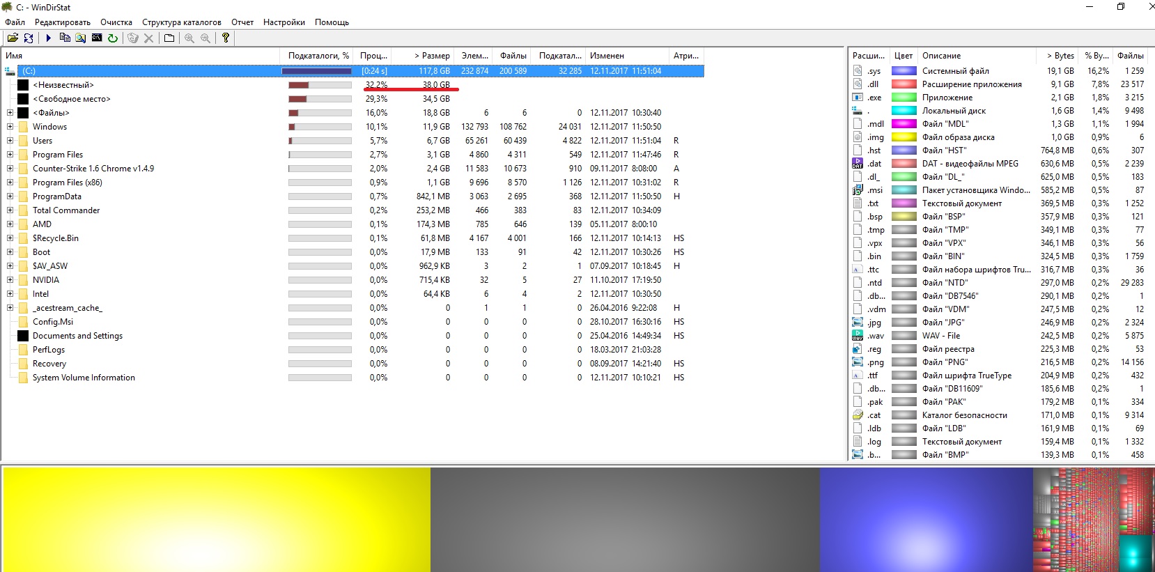Собственно, место на диске исчезло внезапно, и я его никак не могу разыскать. На ссд у меня сейчас занято 83 Гб. Включая всевозможные отображения скрытых и системных файлов, пользуясь для изучения занятого места WinDirStat, могу разыскать только 46 Гб. Отключил защиту с удалением контрольных точек, ну высвободил этим 4 Гб, как и было указано в настройках. 16 Гб виртуальной памяти в файле pagefile, все, больше искать негде. Как разобраться, что случилось?