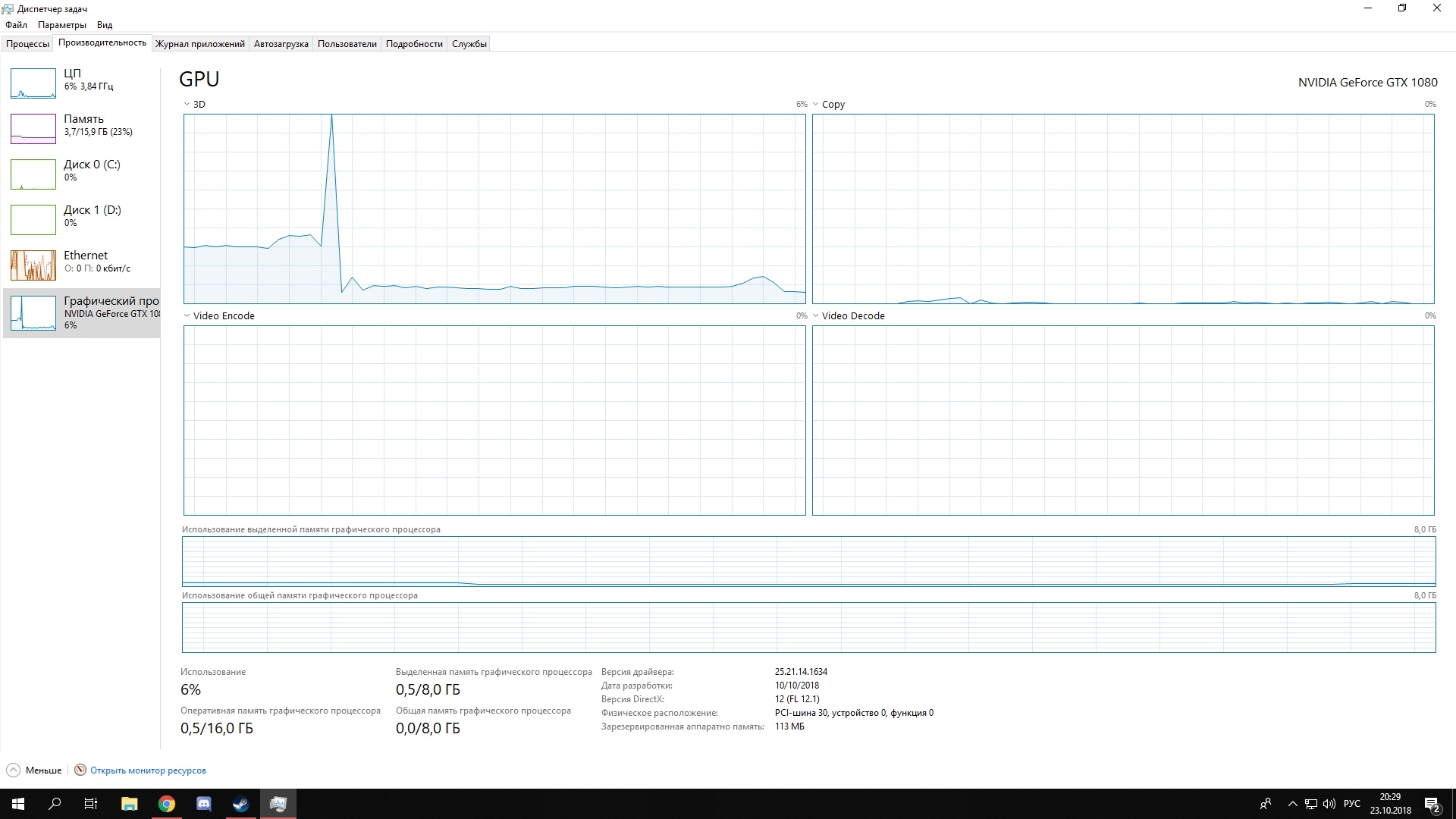 Всем добрый день, появилась такая проблема: переодически график загрузки ГП на видеокарте делает резкий скачок до 100 и мнгновенно падает к нормальному значению. Происходит такое даже в браузере вследствие чего вылетает все, чем бы не был занят в данный момент. Драйвера переустанавливал с нуля с помощью DDU, не помогло. Знающие люди, кто может обьяснить в чем причина проблемы и как ее решить? Конфигурация: AMD R5 2600x; Palit gamerock gtx 1080; Corsair vengeance LPX 3200 MHz 16g; Thermaltake smart DPS-G bronze 700w; MSI x470 gaming pro Хард и ссд на 1тб и 240гб соответственно.