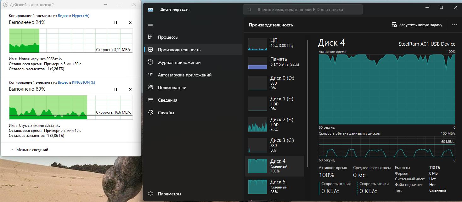 Сегодня заметил странное поведение при копировании файлов на разные флешки с USB-3,0: скорость падает до нуля и постепенно растет до 40 мб/с, затем снова падает до нуля, выписывая синусоиды. До этого на одной флэхе скорость была 180-200 мб/с, на другой, держала около 50 мб/с. Флешки разные, пробовал другие - тоже пишет по синусоиде. По USB 2,0 скорости низкие, в районе 20-30 мб/с, без синусоиды. Пробовал форматировать флэхи, копировал на чистые. Вчера обновил чипсет на ASRock B450M-HDV R4.0, пробовал полностью удалять ПО на чипсет. Из последних изменений в ОС: обновил драйвер на видеокарту SUS TUF Gaming X3 Radeon RX 5700 XT OC, накатил whql-amd-software-adrenalin-edition-23.2.2-win10-win11-feb22