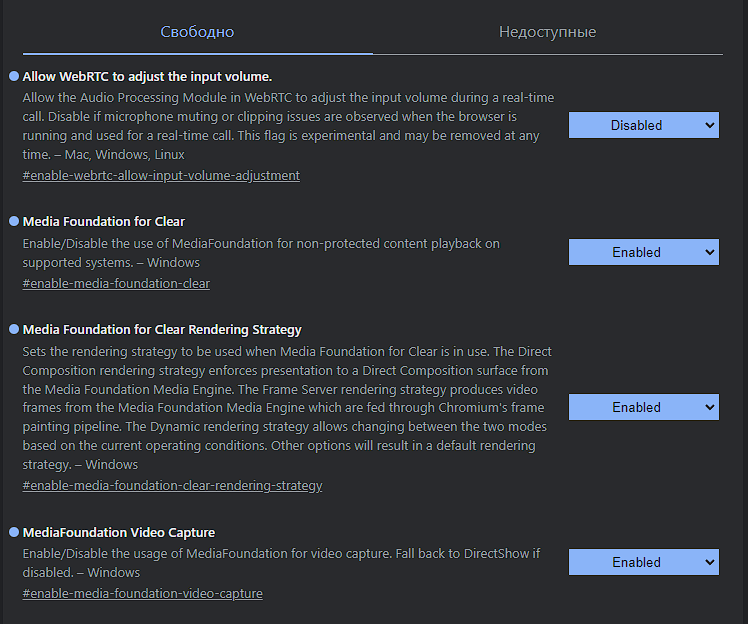 Комментарий к файлу: Включил все Media Foundation, чтобы избавиться от дропа кадров. Выключил WebRTC to adjust the input volume, чтобы Chrome не регулировал громкость микрофона без спроса. Все советую эти настройки. 2024-10-22 17_04_35-Greenshot.png [ 141.92 КБ | Просмотров: 11800 ]